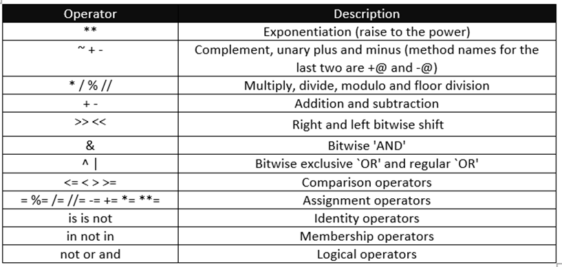 Operator precedence affects how an expression is evaluated. Its similar to math where the given expression will be executed in the order of precedence. The table of precedence is given below. Operations with the higher precedence are mentioned in the top as we go down the table it decreases.